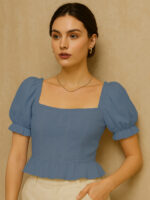 Description: Add a timeless charm to your wardrobe with this elegant blue checkered puff-sleeve top. The delicate square neckline and gathered, voluminous puff sleeves make this piece perfect for a stylish yet comfortable look. Its lightweight, textured fabric features a subtle grid pattern, offering both visual appeal and breathability. The ruffled hemline adds a playful, feminine touch, while its versatile design makes it ideal for pairing with high-waisted trousers, skirts, or jeans for a polished yet effortless outfit.