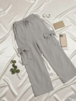 Elevate your casual wear with these chic cargo trousers. Featuring a relaxed wide-leg fit and a comfortable elasticated high-rise waist, they offer all-day comfort without sacrificing style. The standout bow-tie details on the functional side pockets add a unique, feminine flair to the classic cargo design. Pair them with a fitted top and heels for an evening look or a simple tee and sneakers for a stylish day out