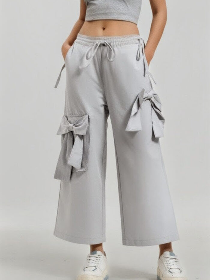Elevate your casual wear with these chic cargo trousers. Featuring a relaxed wide-leg fit and a comfortable elasticated high-rise waist, they offer all-day comfort without sacrificing style. The standout bow-tie details on the functional side pockets add a unique, feminine flair to the classic cargo design. Pair them with a fitted top and heels for an evening look or a simple tee and sneakers for a stylish day out