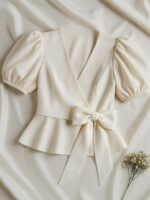 Elevate your wardrobe with this Elegant Bow-Tie Peplum Top in a timeless ivory white shade. Crafted from soft crepe fabric, this top features a flattering V-neckline and puffed short sleeves that add a touch of romance. The peplum hem creates a graceful silhouette, while the statement bow tie at the waist adds a chic, feminine detail. Perfect for pairing with tailored trousers, skirts, or your favorite jeans for both day and evening occasions.