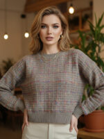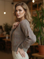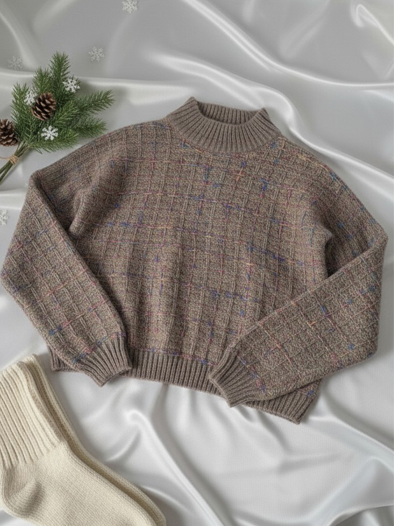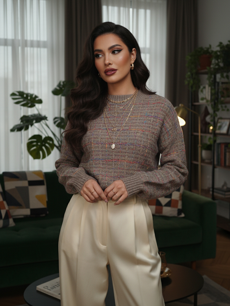 Elevate your everyday style with this taupe multicolor checkered knit sweater, designed for effortless sophistication and comfort. Crafted from a soft wool-blend fabric, it features a subtle grid pattern with delicate multicolored threads, adding a hint of vibrancy to its neutral tone. The ribbed hem, cuffs, and neckline ensure a snug yet relaxed fit, making it perfect for both casual outings and cozy indoor days. Pair it with tailored trousers or denim for a timeless, chic look.