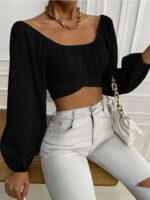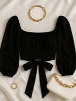 A timeless black puff-sleeve crop top featuring a flattering square neckline, gathered bust detail, and voluminous sleeves for an elegant silhouette. Finished with a statement tie-up bow at the waist for a feminine touch. Perfect to style with high-waisted bottoms for day or evening looks.