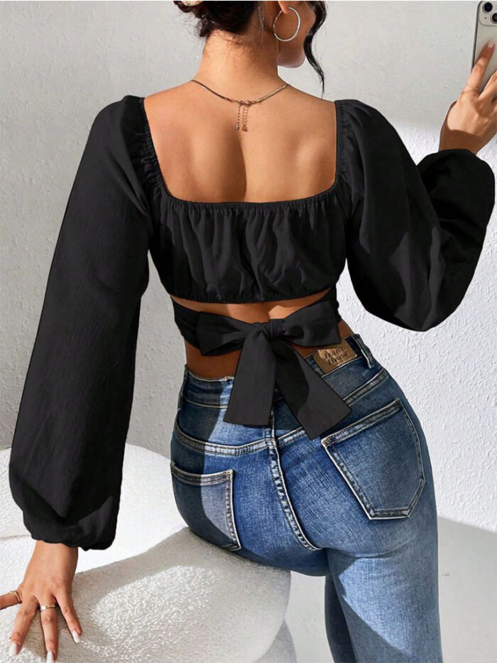 A timeless black puff-sleeve crop top featuring a flattering square neckline, gathered bust detail, and voluminous sleeves for an elegant silhouette. Finished with a statement tie-up bow at the waist for a feminine touch. Perfect to style with high-waisted bottoms for day or evening looks.