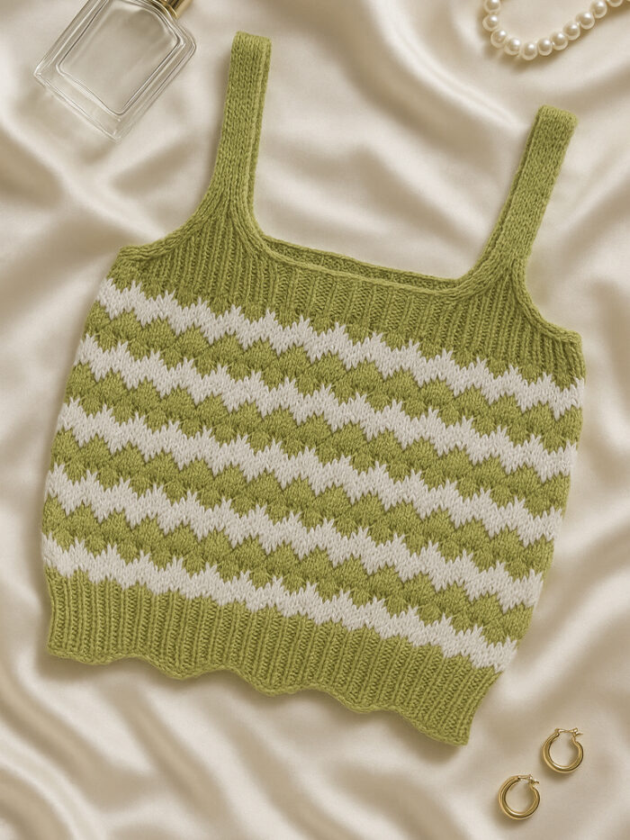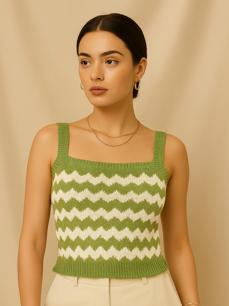 Freshen up your casual wardrobe with this charming olive green and white knitted cami top. Featuring a zig-zag lace knit pattern and a ribbed hem, this crop top combines playful texture with effortless comfort. The thick rib-knit neckline and matching straps give it a sturdy yet feminine look, making it a perfect pick for summer outings or layering in cooler months.