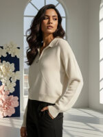 The sweater features a trendy half-zip collar, giving you the flexibility to style it zipped up for a polished vibe or slightly open for a relaxed, fashionable look. Its ribbed hem and cuffs ensure a flattering fit, while the smooth knit texture makes it perfect for pairing with trousers, denim, or skirts.