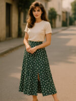 Step into timeless elegance with this Vintage Green A-Line Skirt, designed to channel effortless retro charm. Crafted from a soft and flowy fabric, this skirt features an all-over white floral print on a rich green base, and a subtle front slit for ease and style. The high-waisted fit flatters the silhouette while giving it a classic feminine flair, perfect for day outings, brunch dates, or vintage-inspired shoots.