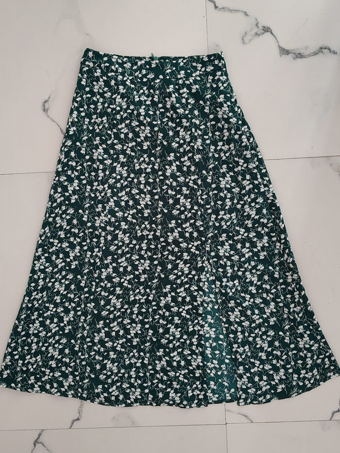 Step into timeless elegance with this Vintage Green A-Line Skirt, designed to channel effortless retro charm. Crafted from a soft and flowy fabric, this skirt features an all-over white floral print on a rich green base, and a subtle front slit for ease and style. The high-waisted fit flatters the silhouette while giving it a classic feminine flair, perfect for day outings, brunch dates, or vintage-inspired shoots.