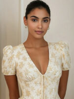 Elevate your everyday style with this elegant floral mini dress. Designed in a soft cream base adorned with subtle golden floral patterns, it perfectly blends romance and sophistication. The deep V-neckline with a delicate tie accent adds a feminine touch, while puffed short sleeves and a fitted bodice create a flattering silhouette that flows into a flared skirt. Ideal for brunch, parties, or casual outings, this dress makes you stand out with effortless charm.