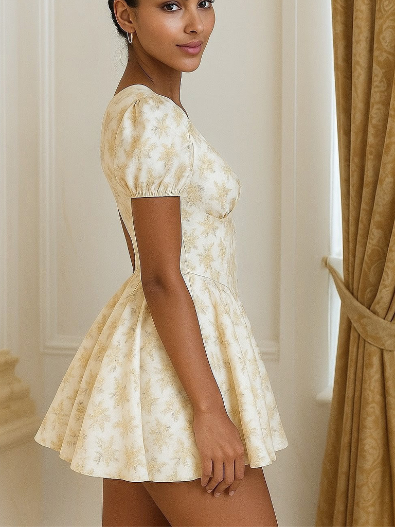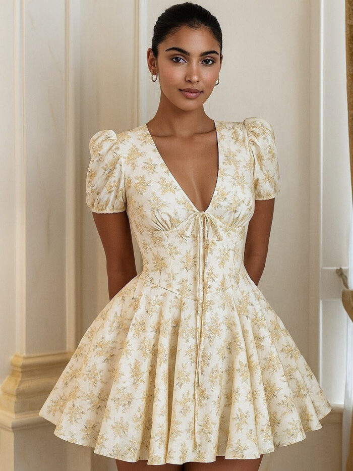 Elevate your everyday style with this elegant floral mini dress. Designed in a soft cream base adorned with subtle golden floral patterns, it perfectly blends romance and sophistication. The deep V-neckline with a delicate tie accent adds a feminine touch, while puffed short sleeves and a fitted bodice create a flattering silhouette that flows into a flared skirt. Ideal for brunch, parties, or casual outings, this dress makes you stand out with effortless charm.