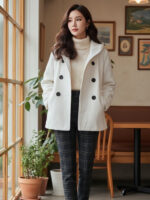 Featuring a structured fit, six classic black buttons, and a functional hood, it blends sophistication with practicality. The smooth inner lining ensures comfort, making it perfect for everyday wear, travel, and winter outings.