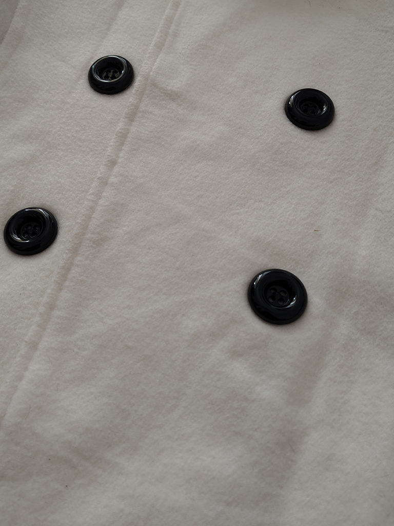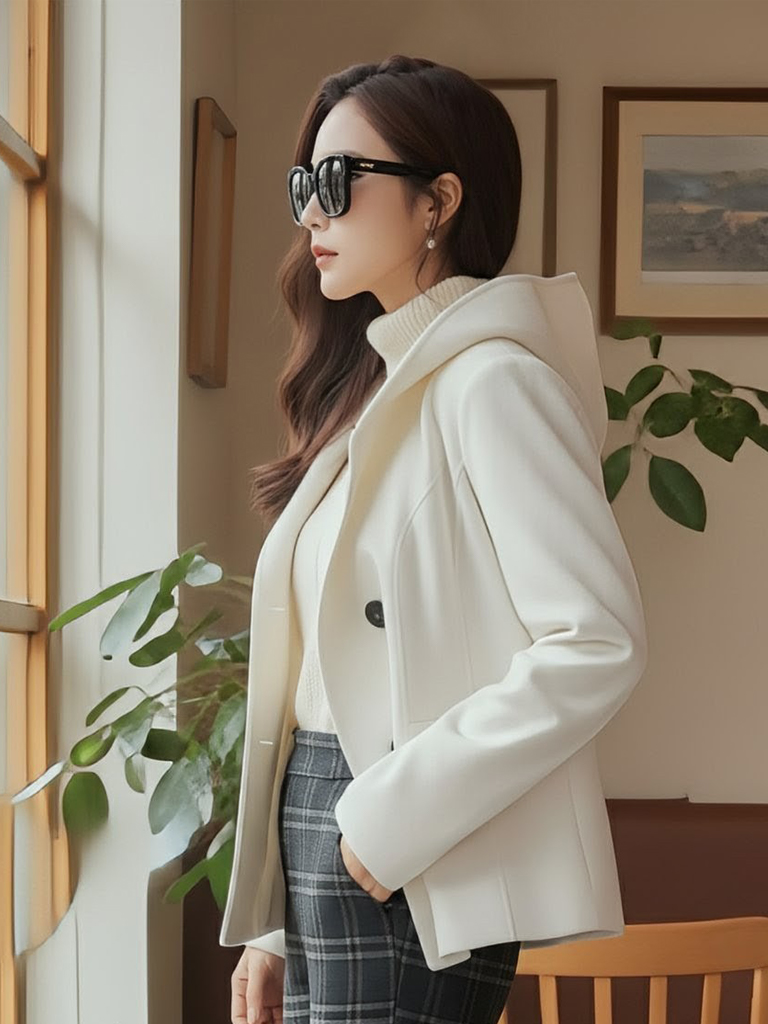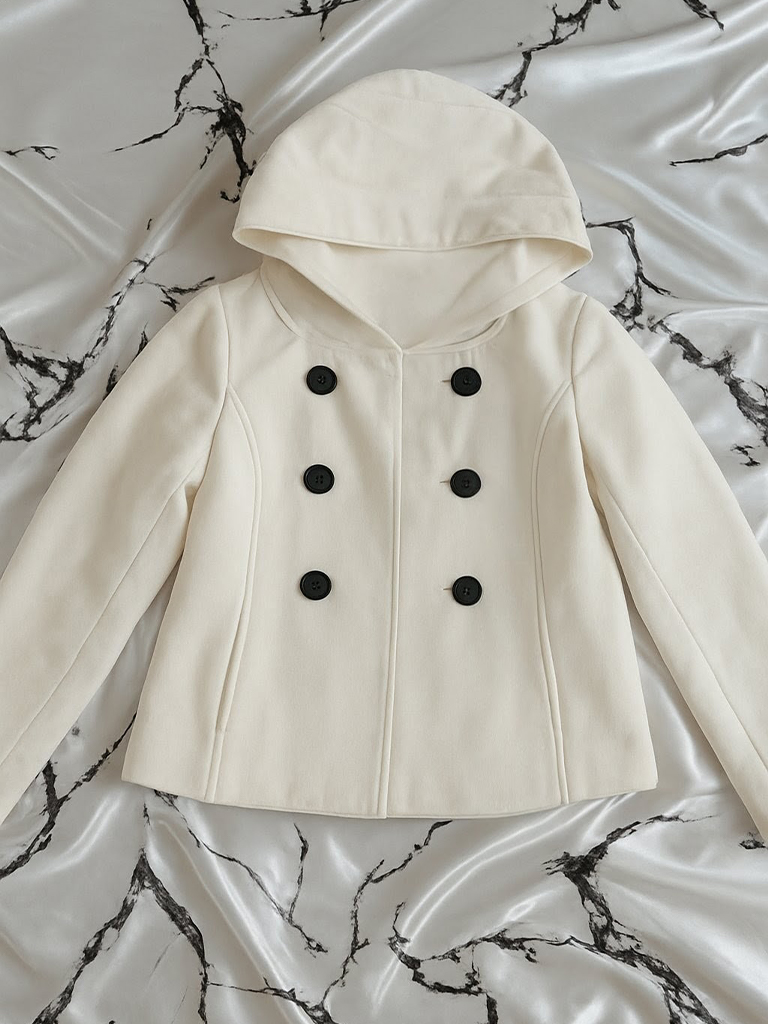 ✅Details: Hooded, double-breasted, structured silhouette, black button accents